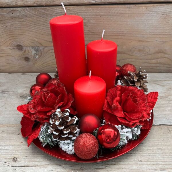 Centrotavola natalizio rotondo su piatto rosso con 3 candele e decoro rosso