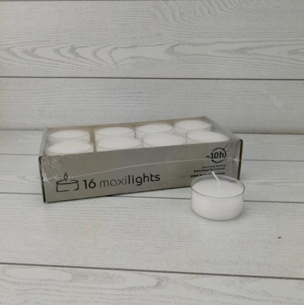 Confezione contenente 16 maxi tealight dalla durata di 10 ore